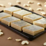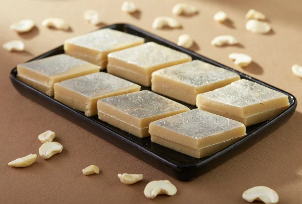 காஜூ கட்லி – Kaju Kadli – Kaju Kadli is a premium Indian sweet made from finely ground cashews, sugar, and flavoured with cardamom, offering a rich and indulgent taste.