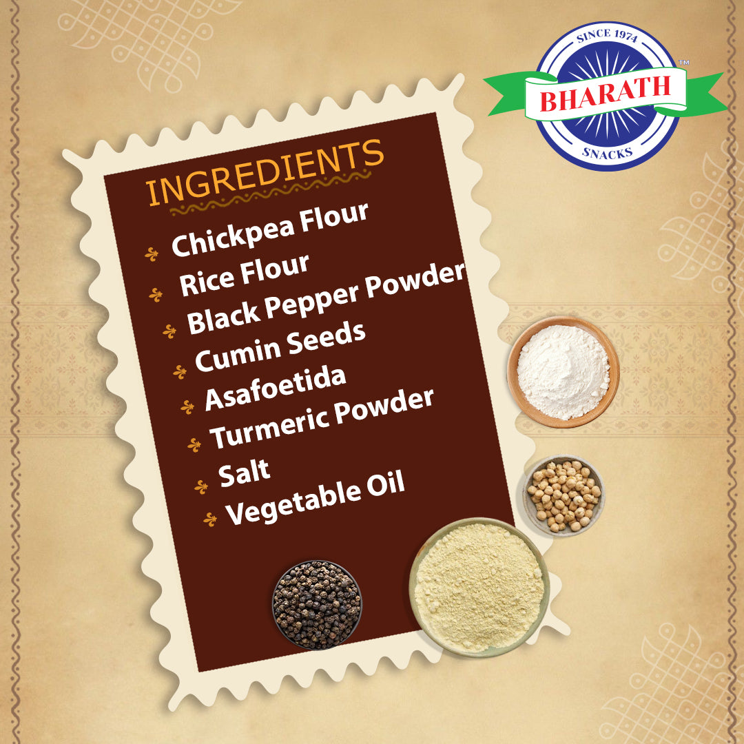 Ingredients: Rice Flour, Gramdhall Flour, Pepper,vanaspathi&Edible Oil.