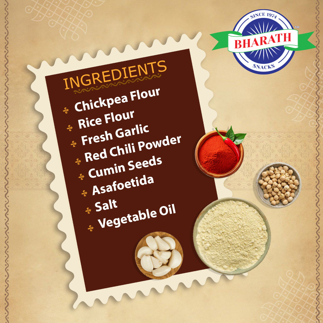 Ingredients: Gram Flour, Rice Flour, Chilli Powder, Salt, Garlic, Pepper