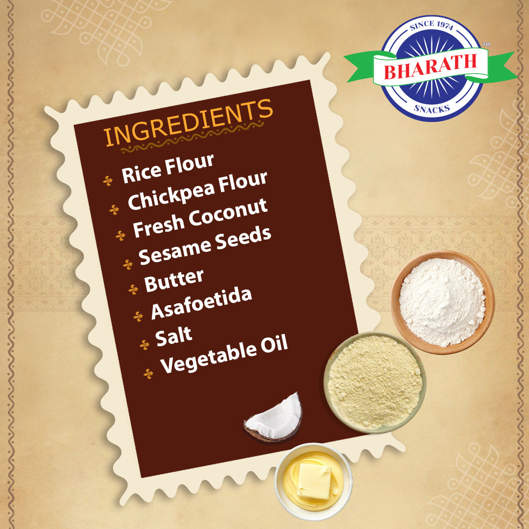 Ingredients: Rice Flour, Fried Grams Flour, Gingelly, Cumin, Vanaspathi, Edible Oil.