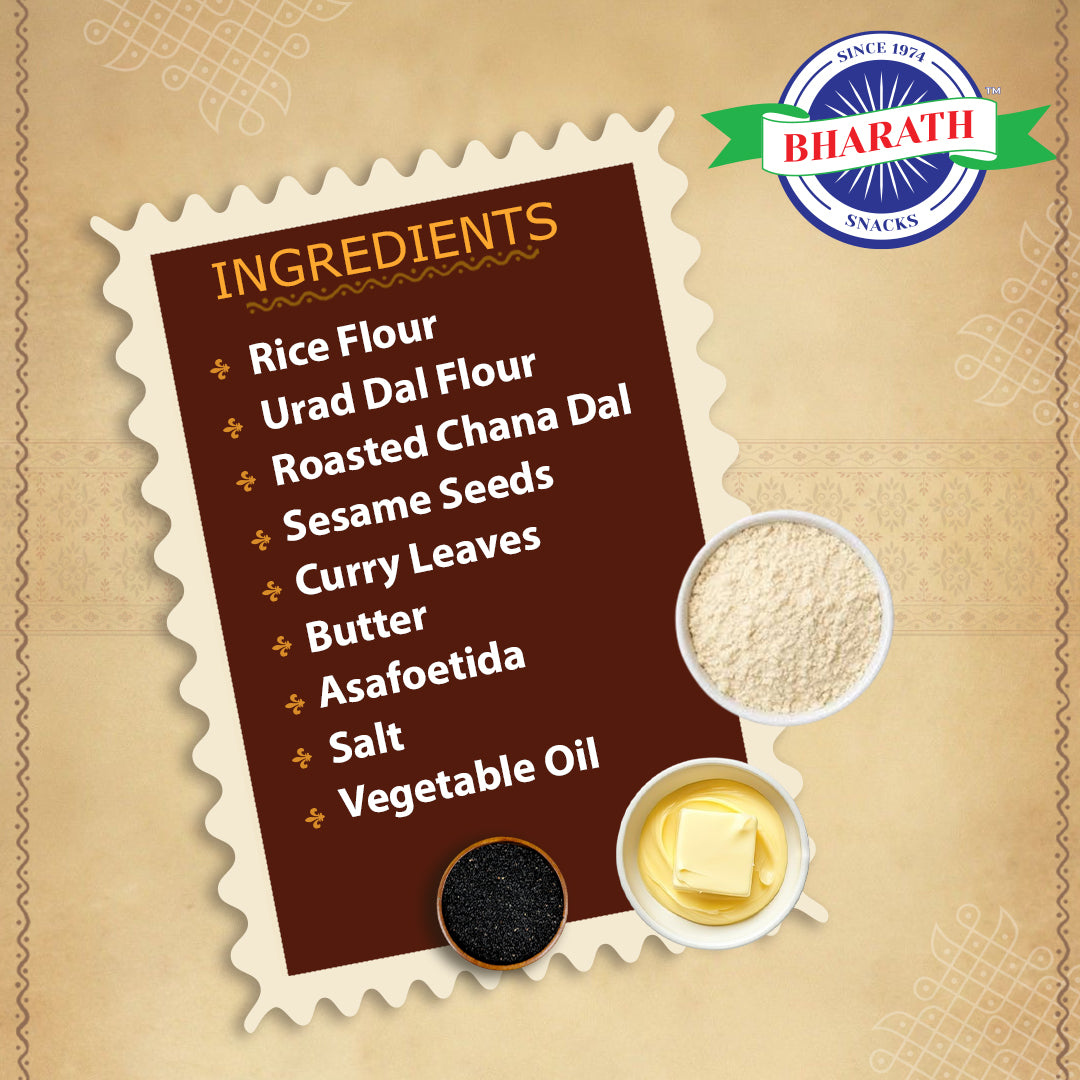 Ingredients: Rice Flour, Fried Grams Flour, Salt, Cumin Powder, Chilly Powter, Red Chilly Bits, Garlic, Gramdhall, Edible Oil.